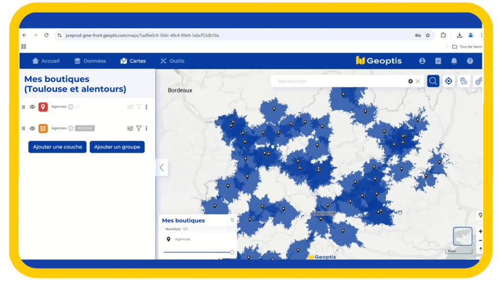 Il doit être utilisé en complément des objectifs commerciaux : analyser les données de terrain, suivre les performances par secteur, ajuster les ressources et planifier les ouvertures de points de vente. Un outil de géomarketing est ainsi un véritable tableau de bord stratégique.